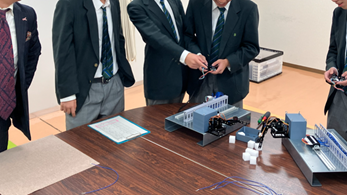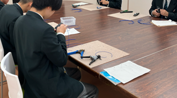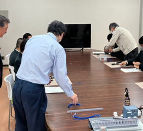 その後 本社301号室で配線組立体験をしていただきました。電線に圧着端子を取り付け配線し,ロボットを動かしていただきました。